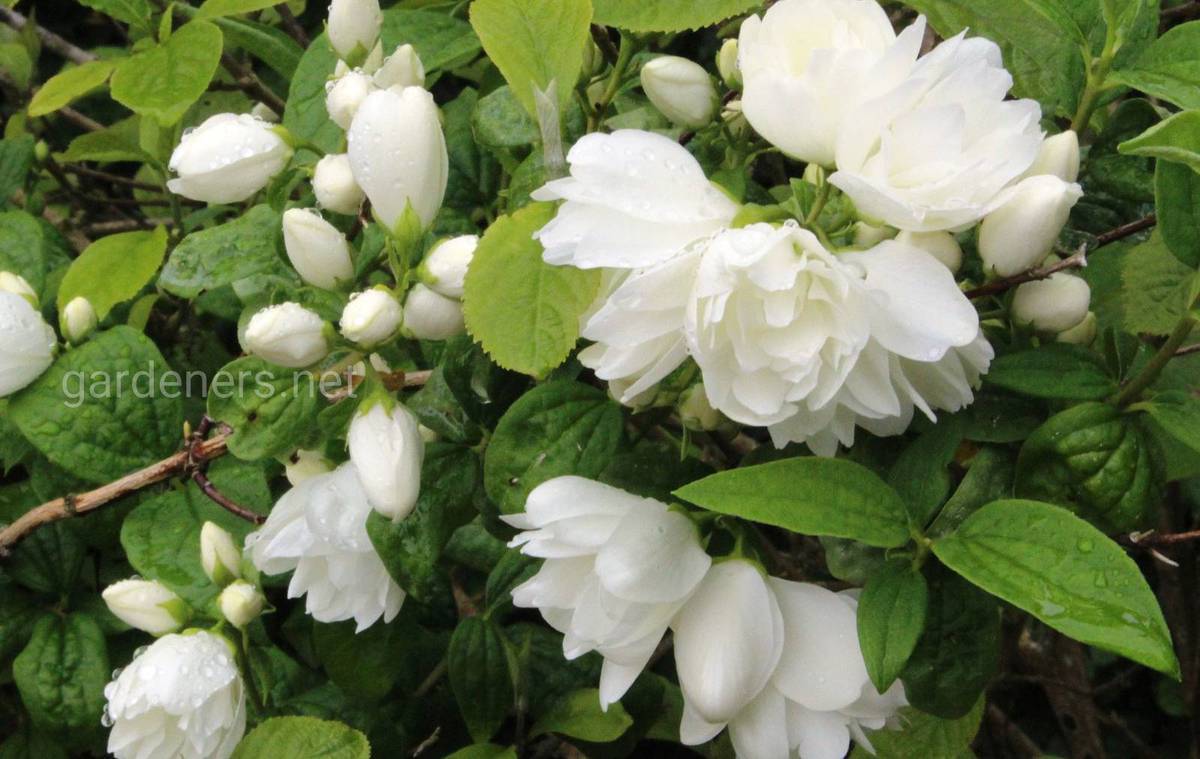 Чубушник-жасмин без особого труда можно сразу же выделить из разнообразных цветущих кустарников по его особому строению. Он достигает в высоту около 4 метров, стебли его бурые с коричневым оттенком и потрескавшейся корой. Листья жасмина бледно-зеленого цвета и довольно крупного размера, а когда приходит осень, они приобретают красочную желто-лимонную окраску. Цветы этого массивного кустарника кремового или белого цвета ,собраны в соцветия в виде кисти. Размер цветков не больше 5 см в диаметре. Как привило, кустарник чубушника начинает очень обильно цвести с конца весны и до середины лета, хотя период цветения зависит от сорта жасмина. На фото представлен цветущий жасмин.