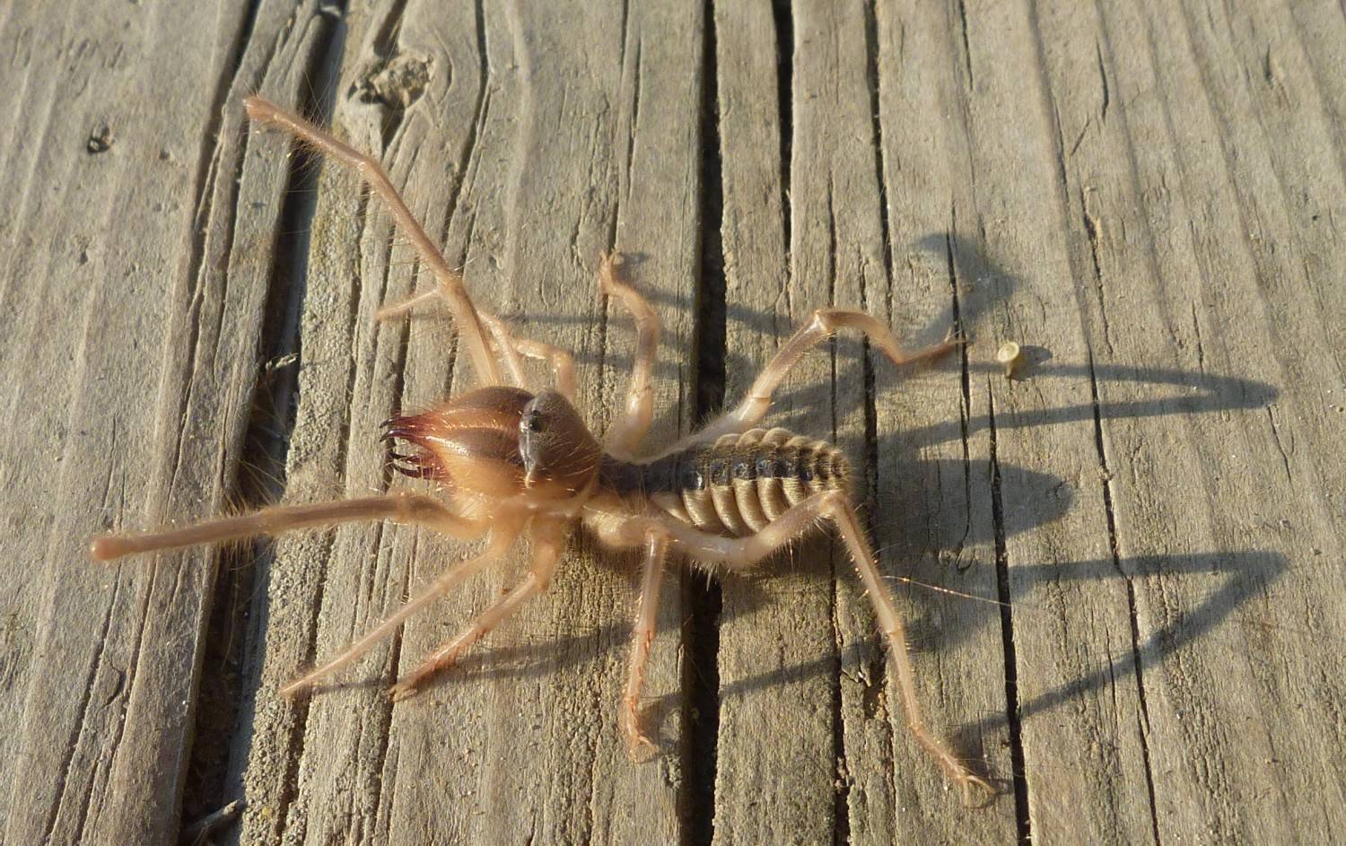 СОЛЬФУГА — он же сольпуга или фаланга. В России встречается на южном берегу Крыма. Эти создания активны в ночное время суток, обладают высокой скоростью передвижения. Могут укусить во время самообороны. Укус не ядовит, но довольно глубок и вызывает инфекцию, вследствие чего рана начинает значительно гноится. Поэтому следует высосать место укуса, при этом выплёвывая заражённую слюну, после чего обработать рану антисептиком, далее рекомендовано смазывать место укуса гелем(мазью), содержащим антибиотик. Ну и о враче не стоит забывать, если есть возможность обязательно обратитесь за помощью.
