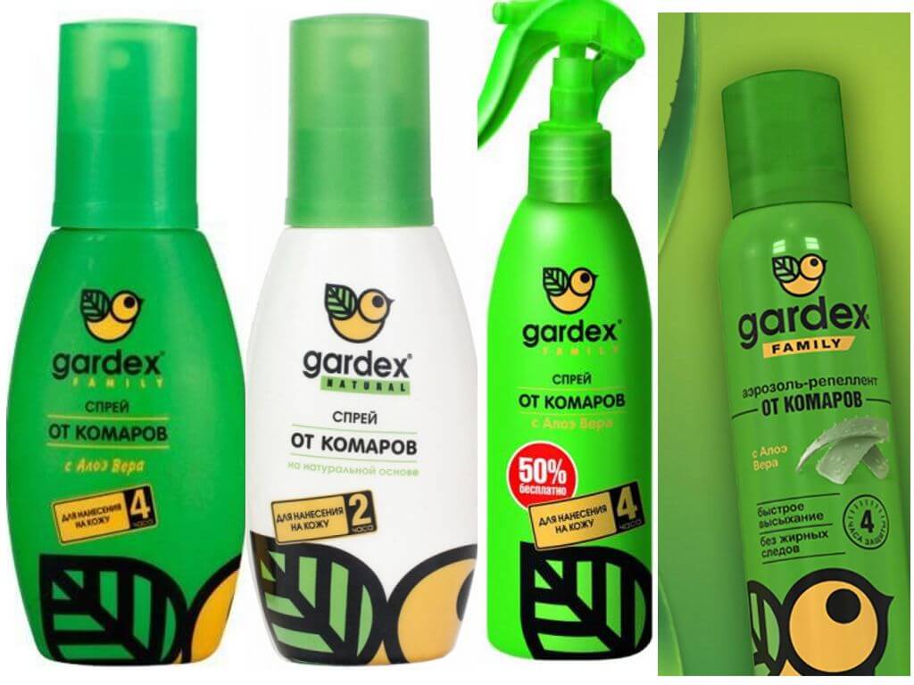 - Gardex Family (темно-зеленый флакон) – спрей 250 мл, содержащий экстракт Алоэ Вера и водный раствор ДЭТА, оказывает защитное действие в течение 4 ч для всех членов семьи, которые планируют совершить прогулку на дачу или в лес, где есть кровососущие насекомые, наносится на кожу, не применяется у детей до 12 лет и беременных женщин, цена – около 540 руб.;
