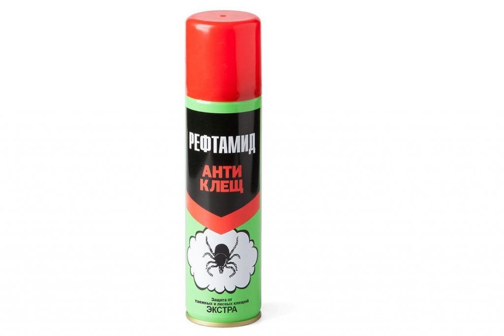 Аэрозоль Рефтамид «Антиклещ» Экстра, от таежных и лесных клещей, 145мл, (чёрно-зелёный) оказывающие негативное воздействие на нервную систему паразитов. Сначала наступает паралич, затем – смерть.