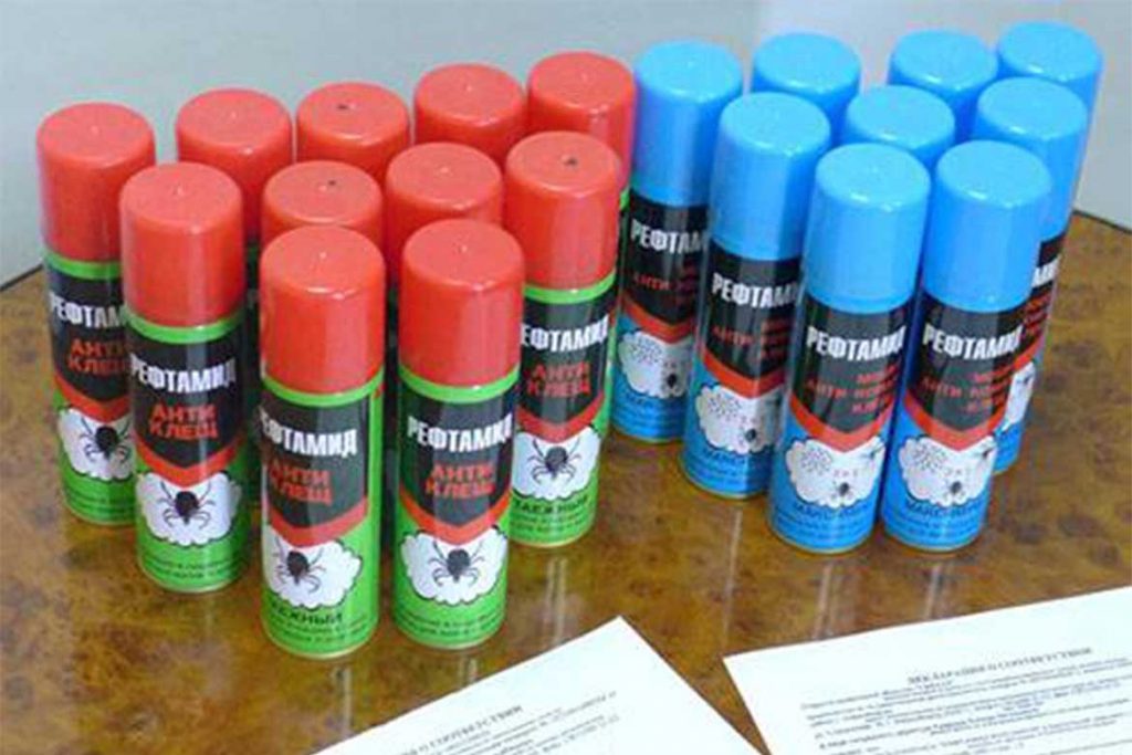 Выпускается препарат в черно-голубом баллоне. Этот опознавательный знак позволяет быстро найти нужную разновидность продукта среди широкого ассортимента репеллентов Рефтамид от клещей. Нужно учитывать, что вся одежда, которая была обработана, должна храниться в герметичном полиэтиленовом пакете. Если это условие не выполняется, срок действия активного вещества сокращается.