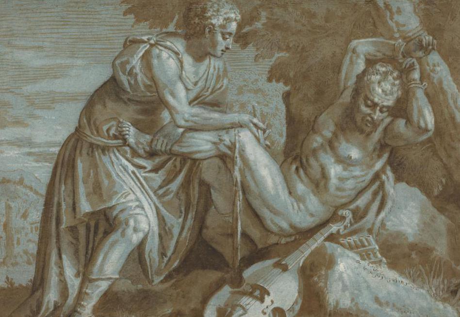 Аполлон считался покровителем наук и искусств, особенно музыки. Лира является одним из его атрибутов. Но существует любопытный миф, согласно которому, один из сатиров (существа, у которых верхняя часть тела человеческая, а нижняя – козлиная) по имени Марсий достиг такого совершенства в игре на флейте, что осмелился вызвать Аполлона на музыкальный поединок. Бог принял вызов. Его игра на лире так восхитила всех судей, что они единодушно отдали победу ему. Однако этого мстительному богу оказалось мало. Он приказал изловить несчастного сатира и заживо содрать с него кожу.
