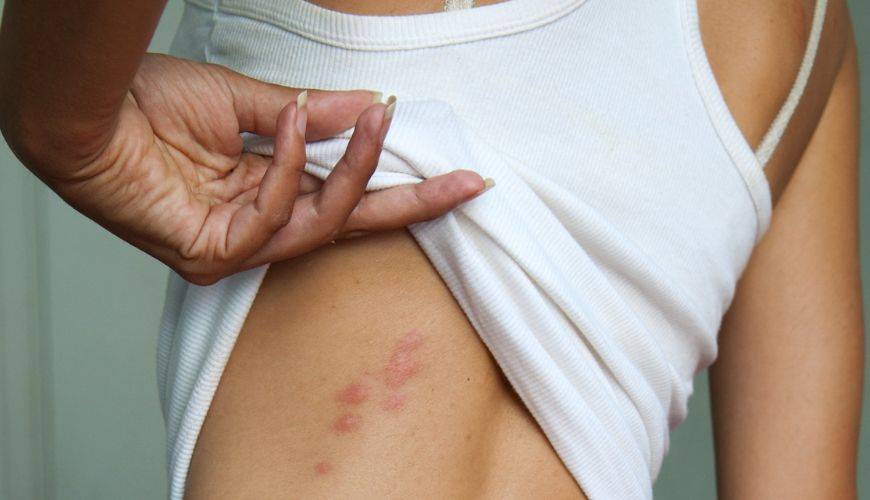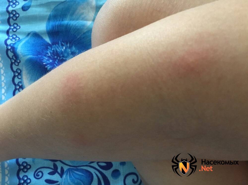 Клоп не кусает 1 раз – скорее всего, на коже будет цепочка красных зудящих точек. Излюбленные места нападения – лицо, руки, шея, но велика вероятность появления укусов на животе или спине, особенно если паразит не приполз из других частей помещения, а уже изначально находился в постели.