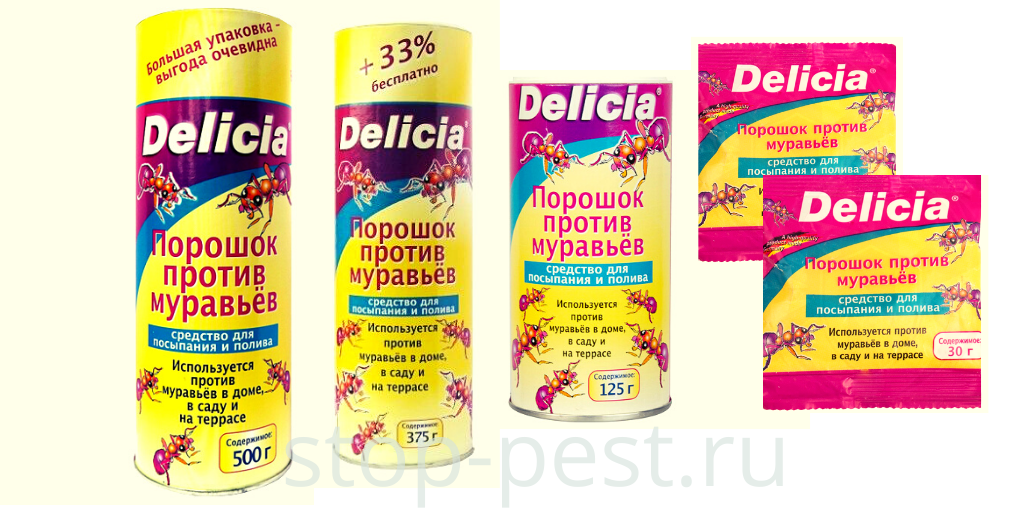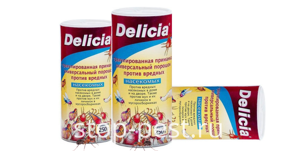 Это немецкий порошковый инсектицидный препарат. Он выпускается в разных объемах, что позволяет купить именно то количество, которое необходимо. Delicia борется с насекомыми, как в помещении, так и на открытых участках. Это средство хорошо тем, что даже простой контакт с ним убивает насекомых
