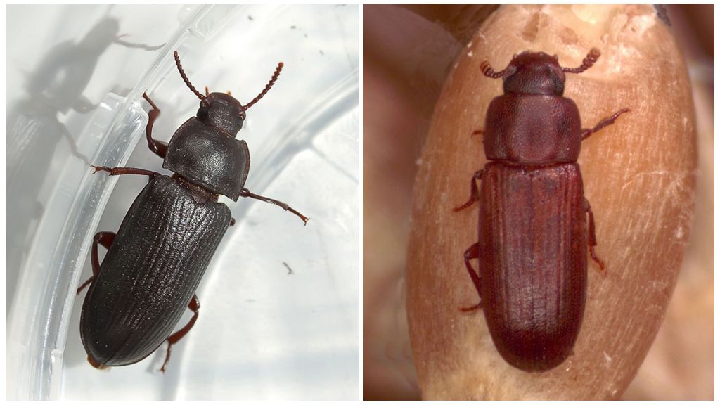 Хрущак – это большой черный жук длиной до 1,8 см, тельце у него сплющенное, ног всего 6 (3 пары). Окрас туловища – черно-бурый и блестящий, брюшко имеет красноватый оттенок. Самки откладывают яйца по 200 шт. в гнездо. Личинка вредителя (называемая в народе мучным червем), имеет больший размер до 2,5 см и буро-желтый окрас. Она питается зерном, мукой и отрубями. По мере роста личинка проходит 4 линьки.
