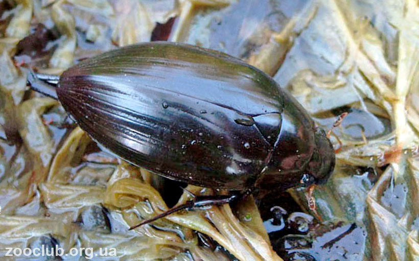 Водолюб большой черный (Hydroohiluspiceus) относится к отряду жесткокрылых, семейству водолюбов. Одно из крупнейших насекомых водной среды достигает размеров 28-50 мм в длину и 15-20 мм в ширину. Тело овальной формы, выпуклое. Окраска черная с зеленовато-бурым отливом. По бокам брюшка оранжевые пятна. Жесткие надкрылья покрыты бороздками. Голова крупная, полностью покрыта цельной капсулой. Глаза большие, усики состоят из 9 члеников. Рыжие антенны заканчиваются ассиметричной булавой.