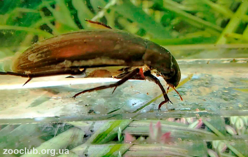 В аквариуме водолюба следует держать отдельно от хищных жуков, которые могут причинить вред этому мирному насекомому.