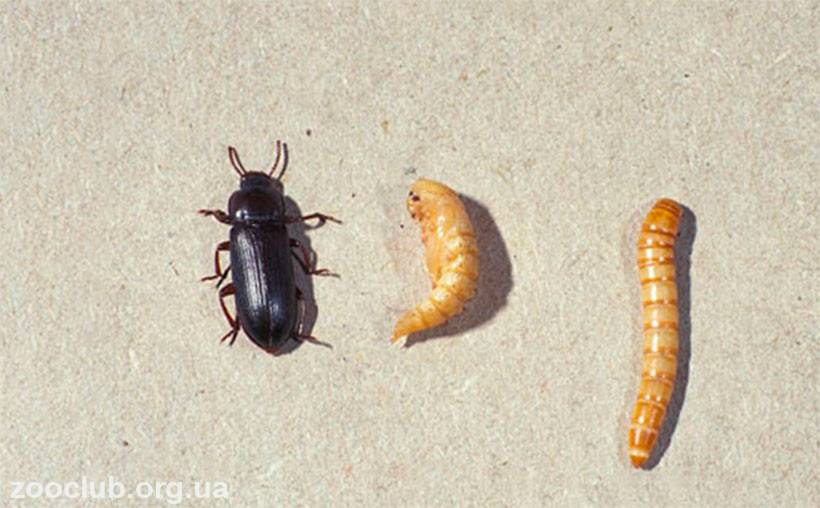 Мучной хрущак (tenebrio molitor) –жук размером до 18 мм имеет продолговатое тельце, покрытое черным или буро-коричневым панцирем. Он относится к семейству чернотелок, представители которого распространены повсеместно. Взрослые особи способны жить даже в прохладных помещениях, личинкам же для развития требуется тепло. При отрицательных температурах насекомые погибают. Размножается жук хрущак достаточно активно: самка в течение жизни способна отложить до 1 000 блестящих молочного цвета яиц. Из них уже через 10 дней появляются личинки, которых в народе называют мучными червями. Личинки мучного хрущака достигают в длину до 3 см. Имеют очень развитые верхние челюсти и лапки, благодаря которым они могут быстро передвигаться по поверхности сыпучих продуктов.