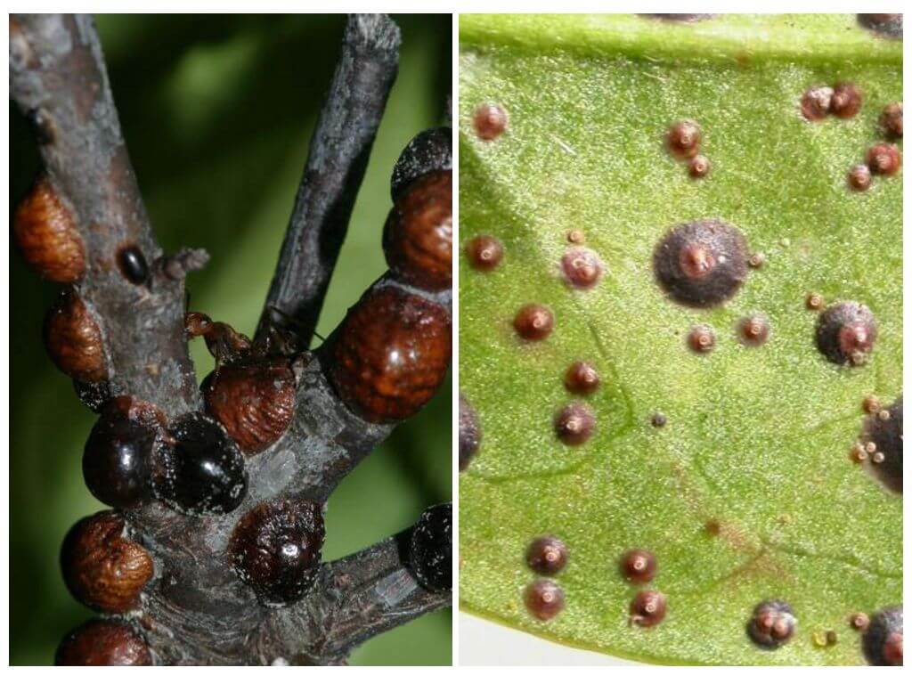 Появление на стволе, ветках или нижней части листьев едва заметных «бугорков» от светло-зеленой до коричневой гаммы говорит о том, что здесь прочно закрепилась колония щитовок – самки и личинки.