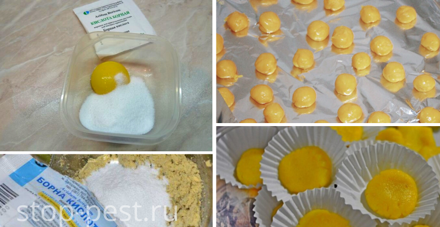 В данном рецепте порошок борной кислоты смешивается с яичными желтками (сырым или вареным). Из полученной смеси формируются маленькие шарики, которые располагают в местах обитания муравьев или тараканов