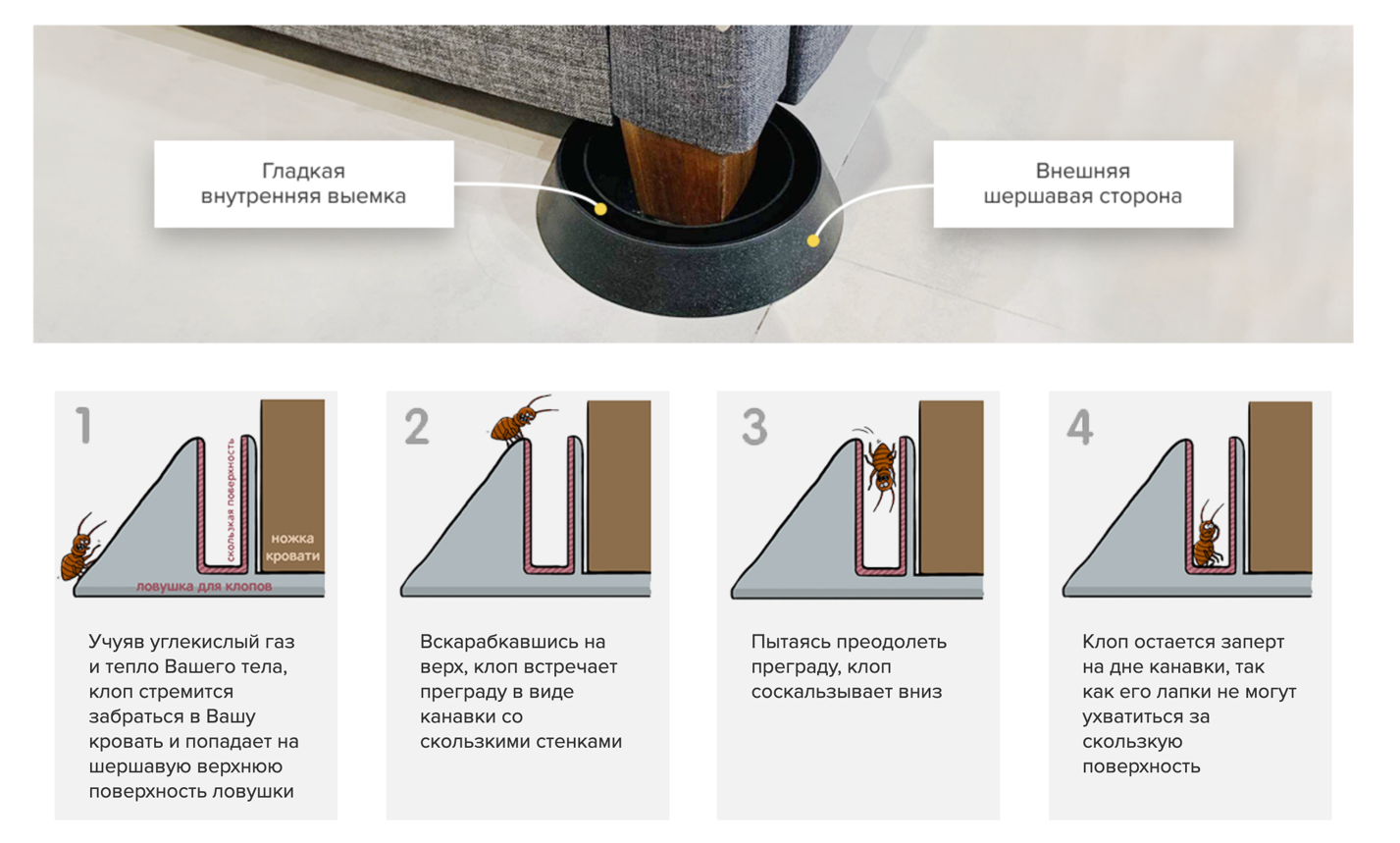 Ловушка представляет собой специальные подставки с канавкой под каждую из ножек кровати, и продается комплектом из четырех таких ловушек.