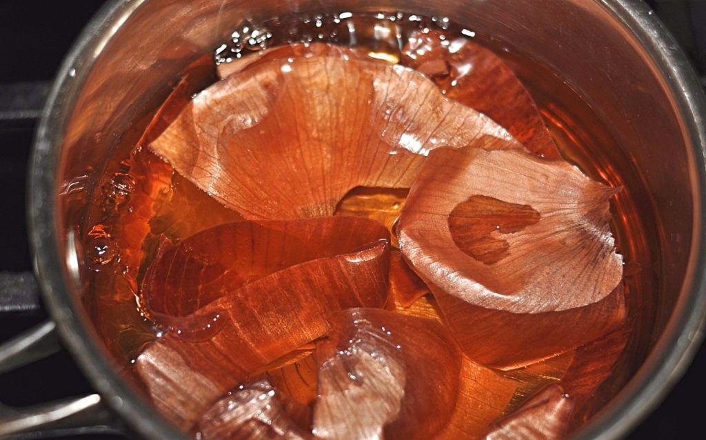 - Половину ведра заполняют луковой шелухой и мелко измельченными луковицами, затем заливают 10 л горячей воды. Настаивают сутки, процеживают и перед использованием разбавляют водой 1:2.