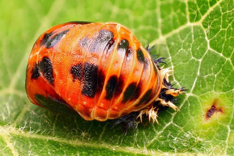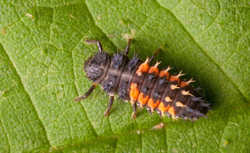 Спустя 1-2 недели из отложенных яиц появляются пестро окрашенные личинки божьей коровки овальной или плоской формы. Поверхность их тела может быть покрыта тонкими щетинками или волосками, а рисунок на теле образован сочетанием желтых, оранжевых и белых пятен.