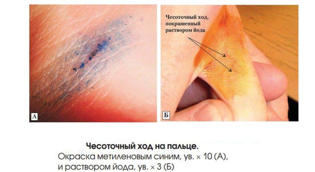 Дополнительные методы исследования не всегда дают точный ответ. Поэтому диагноз можно устанавливать без лабораторной диагностики. Но пренебрегать ею не стоит. Чесоточные ходы для лучшей визуализации прокрашивают раствором йода или бриллиантовой зеленью. После того как краситель впитается, на коже остаются чёткие прокрашенные, извилистые линии.