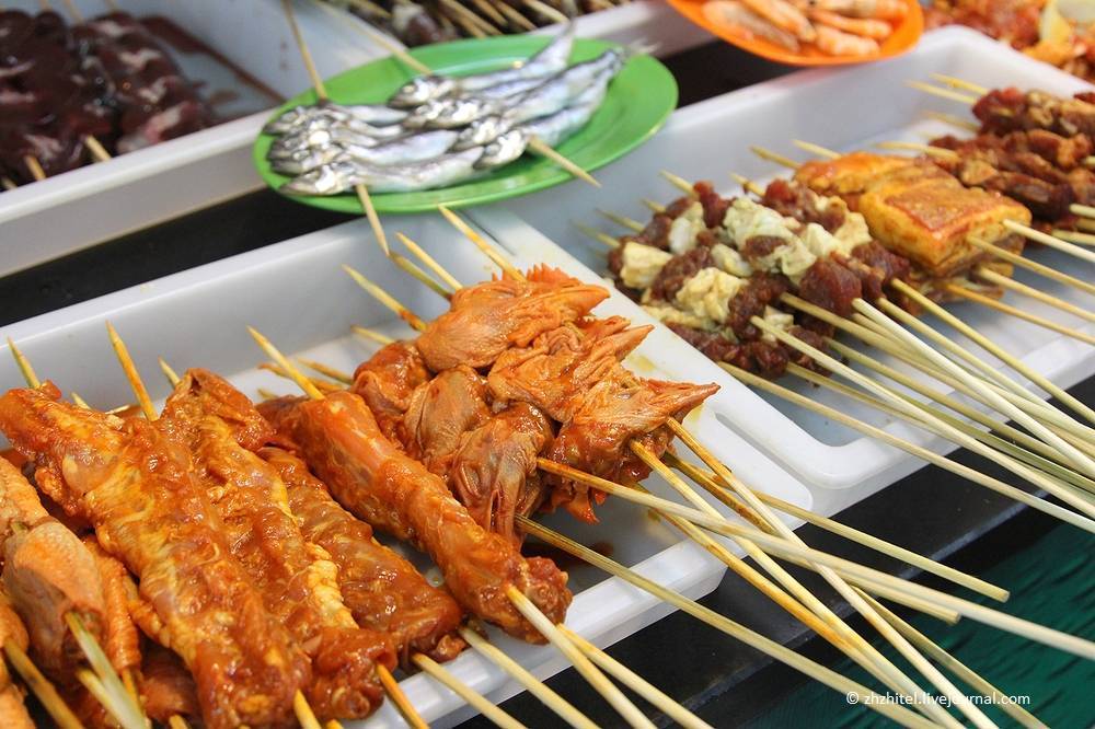 О, великий и ужасный китайский фастфуд! Чего здесь только не едят! Буквально всё, что движется и шевелится, может быть приготовлено и съедено. Вечером китайцы выходят на улицы, чтобы после напряженного трудового дня перекусить в многочисленных уличных кафешках. Разумеется, нельзя было не поужинать в такой экзотической обстановке.