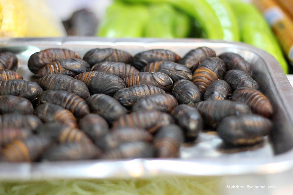 12. Эх, была не была. Одно из самых деликатесных блюд – личинки шелкопряда. Берем на пробу.