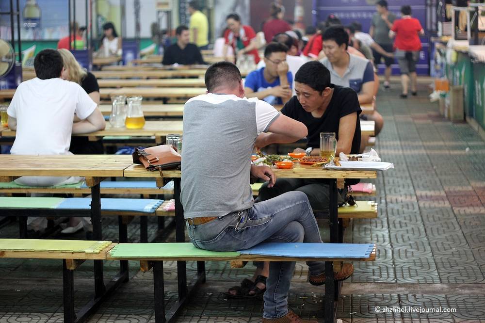 Вечером китайцы выходят на улицы, чтобы после напряженного трудового дня перекусить в многочисленных уличных кафешках. Разумеется, нельзя было не поужинать в такой экзотической обстановке