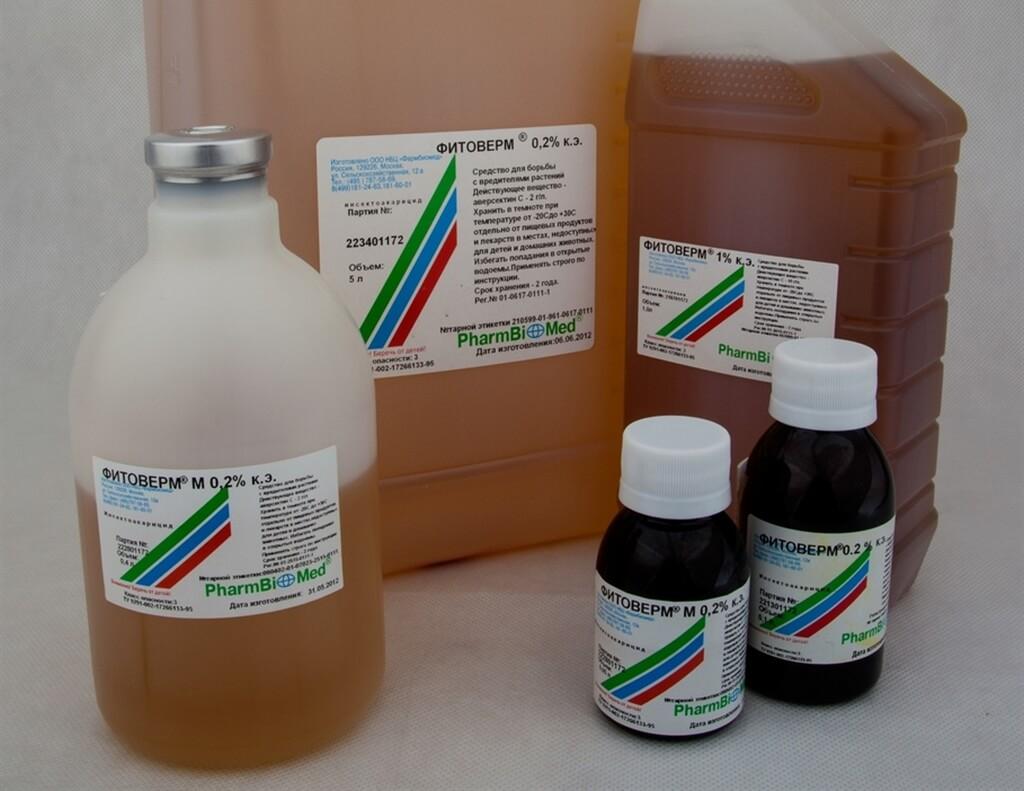 - Фитоверм – бактериальное средство, воздействующее на большое количество вредителей. На ведро воды достаточно от 1 до 4 мл препарата;