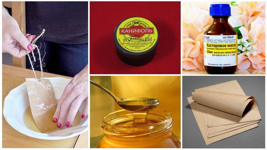 - 400 г канифоли, 100 г чистого пчелиного меда, касторка 200 мл, 40 мл глицеринового масла.