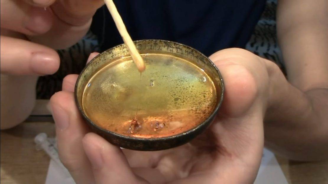 Канифоль всегда топят на водяной бане, также, как и смолу. Все ингредиенты укладывают в жестяные банки, которые потом можно выкинуть. Когда смола начнет таять, ее помешивают, чтобы не было не растворившихся кусочков. В растаявшую канифоль добавляют другие ингредиенты. Масса должна превратиться в однородную смесь, с единым цветом.