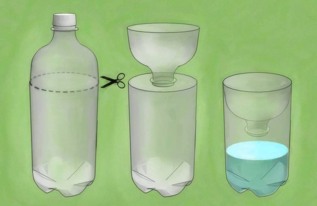 Из бутылок делают полезные предметы: от поилок до тапочек. Ножницами вырезают верхушку и откручивают крышку. Наливают внутрь бутылки воды. Добавляют немного сахара и тщательно перемешивают. Также в воду засыпают свежие дрожжи и ложку меда. Верхнюю отрезанную часть переворачивают и вносят в оставшийся нижний отрезок.