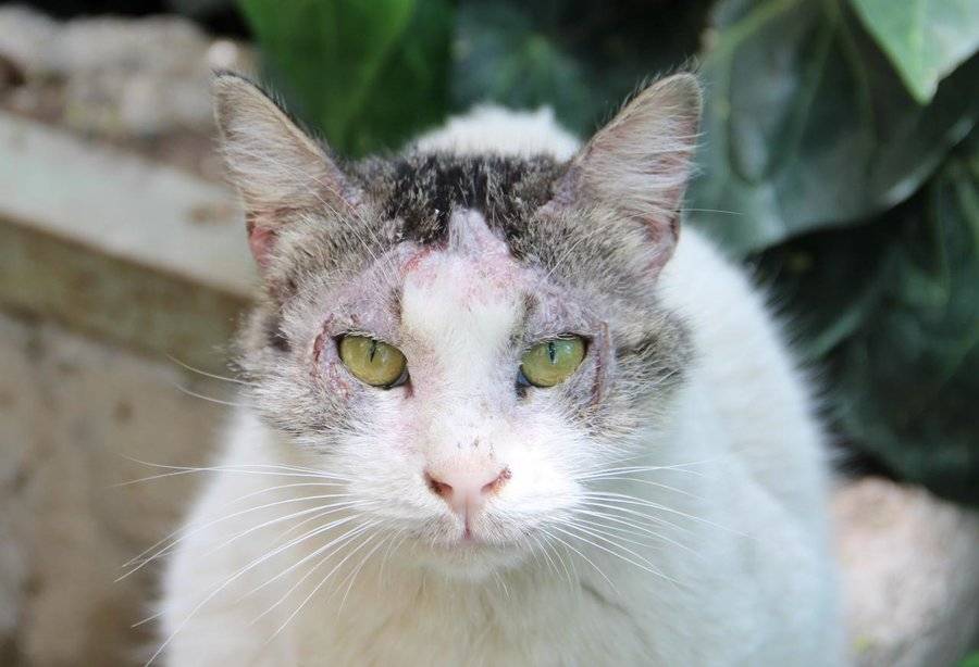 - при прогрессировании заболевания кожа утолщается, собирается в складки, покрывается струпьями, может кровоточить, зудеть. Морда кошки становится похожей на Фантомаса, как приводят пример многие литературные источники, или еще череп называют «львиная голова» — сужается разрез глаз и голова кажется непропорционально большой по отношению к телу за счет огрубевания, утолщения и складчатости кожи и струпьев;