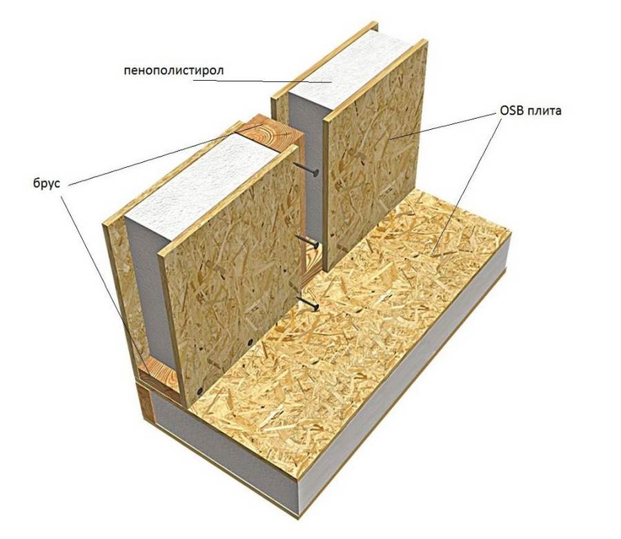 Этот материал состоит из двух плит ОСБ, между которыми проложен слой утеплителя (пенопласта). Получается своеобразный сэндвич (строительный «многослойный бутерброд»). Отсюда еще одно название — сэндвич панели.