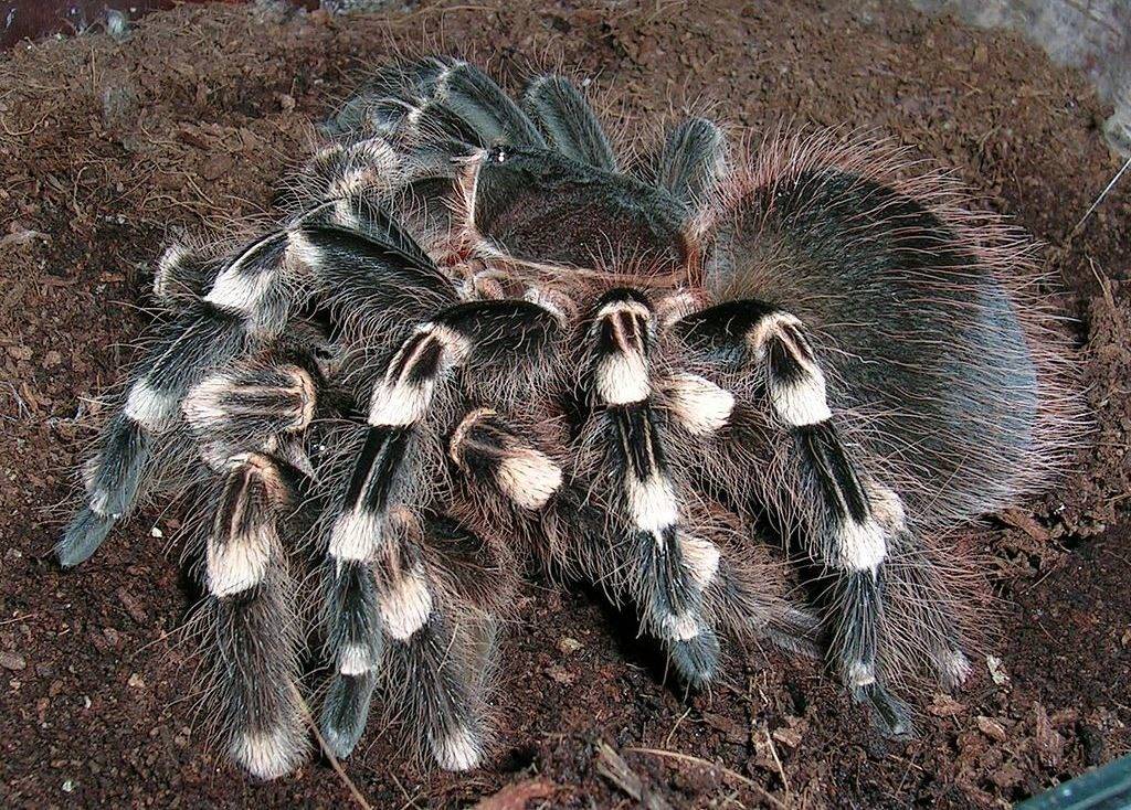 - Мексиканский. Пушистый, длина брюшка до 14 см, черно-серого цвета, сгибы лапок рыжие (второе название паука – «красноколенный тарантул»). Отличаются медленным ростом и созреванием: самцы способны к оплодотворению в возрасте 4-х лет, редко живут дольше 10, самки могут давать потомство в 6-7 лет, доживают до 20-30 лет. В неволе созревание происходит быстрее, что сокращает продолжительность жизни.