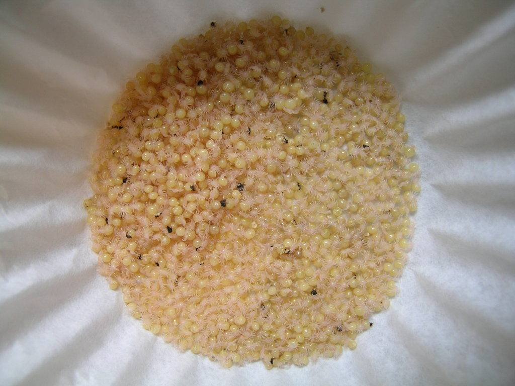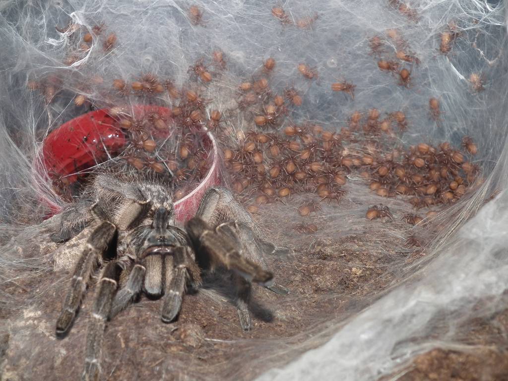 Съесть она их может и в том случае, если нарушится температурный или влажностный режим или когда кладка начнет гнить. В течение 6-7 недель паучиха будет охранять свои коконы, изредка переворачивая их. В этот период она очень агрессивна, будьте осторожны. Если повезет и все пройдет гладко – из яиц вылупятся нимфы – они имеют форму яйца, только с ножками. После двух линек нимфы становятся личинками. И личинки и нимфы еще не могут питаться самостоятельно, едят то, что есть в яйце, поэтому пока могут находиться в одном террариуме. Когда из личинки вылупится настоящий паук, его следует немедленно отсадить, иначе он может съесть еще не вылупившихся своих братьев и сестер.