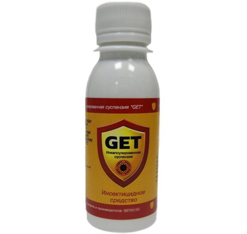 Get- это микрокапсулированный препарат, состоящий из диспергированного хлорпирифоса, на основе воды. Инсектициды, входящие в состав этого препарата, могут действовать на поверхности по несколько недель, они переносятся на лапках клопов, попадая в организм насекомого. Таким образом бороться с клопами не составит труда. Прилипшие частички распространяются по организму и отравляют его за короткий промежуток времени.