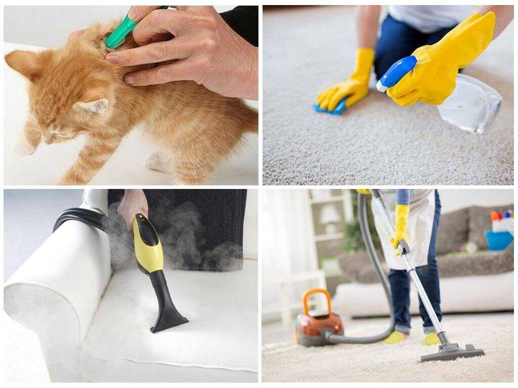 Если в доме обитает кот или собака, обработка начинается с животного. Вывести блох у кошки, собаки можно посредством аптечных средств. В ветеринарных аптеках представлен широкий выбор препаратов от блох для домашних питомцев: шампуни, спреи, капли, ошейники для различных пород кошек, собак, их весовой категории и густоты шерстяного покрова. После уничтожения паразитов на животном на него следует надеть противоблошиный ошейник, чтобы исключить повторное заражение. Если применялись капли на холку, эффект от которых длится 1-3 месяца, в использовании аксессуара нет необходимости. В обязательном порядке необходимо обработать все принадлежности домашнего любимца: кошачьи или собачьи подстилки, игрушки, аксессуары, домики. Уничтожить вредителей можно посредством кипячения или использовать раствор препарата от блох, который применялся для животного. Влажная и сухая уборка в квартире. Самки не утруждают себя откладыванием яиц в тихом укромном месте, делают это на ходу, вследствие чего эмбрионы разлетаются по всему помещению. Яйца находятся в обивках мебели, в детских игрушках, в ворсе ковров. С помощью пылесоса можно значительно сократить количество яиц. Текстиль, постельные принадлежности необходимо обработать парогенератором или подвергнуть другому методу температурного воздействия: стирка при высоких температурах, обработка горячей подошвой утюга, нахождение под солнечными лучами или вымораживание, если на улице зафиксированы минусовые температуры. Все доступные поверхности необходимо помыть дезинфицирующим раствором. Используя инсектицидные средства от блох, следует позаботиться о собственной безопасности. Все работы проводить в респираторе, закрытой одежде, перчатках. Во время дезинсекции в квартире не должны находиться домочадцы, животные. Аквариумы, инсектариумы накрывают стеклом. Отраву от блох наносят на предметы мебели, плинтусы, стены на расстоянии 1 метра от пола