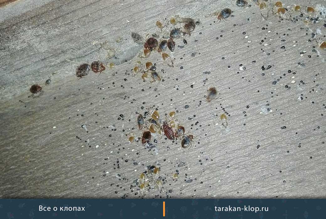 Учитывая, что паразиты выползают преимущественно по ночам (пока им хватает пищи), они днем обустраиваются там, куда не попадает солнечный свет. Причем набиваются клопы в довольно узкие щели, уплощенные места. Здесь остаются следы их жизнедеятельности – черные точки. Если паразитов много, то экскременты пачкают большие участки покрытия, т. к. сливаются воедино. В результате выглядит такое скопление, как большое темное мятно.