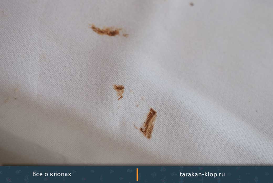 - На постельном белье следы крови от раздавленных клопов, также кровь может подтекать из ранки, через которую клоп пил кровь и также пачкать постель.