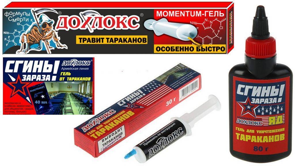 - «Мгновенный яд Дохлокс», гель от тараканов. Объем 100 мл. Объёма хватает на площадь от 10 до 60 кв. м. Цена 297 рублей.