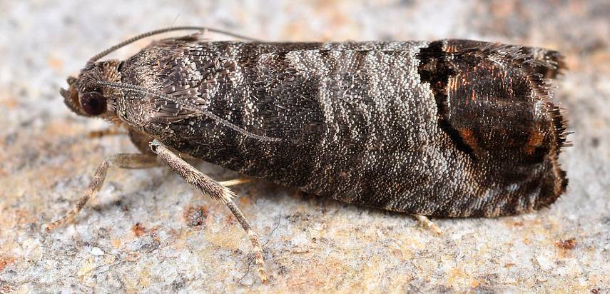 Бабочка яблоневой плодожорки — это достаточно крупный вредитель. Она имеет размах крыльев порядка 18-21 мм. На туловище находятся две пары крыльев — передние темно-серой окраски с темными волнистыми линиями, которые располагаются поперечно, и задние, имеющие светло-коричневый оттенок. Этот вредитель имеет очень удачную маскировку — стоит бабочке сесть на кору или ветку дерева и сложить крылья, и она сразу же сливается с ней и различить ее невооружённым глазом практически невозможно.