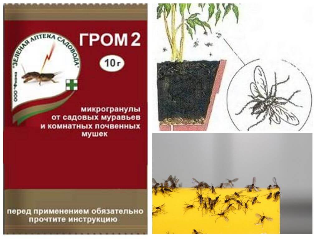 В большинстве случаев не обойтись без применения специализированных средств. Опытные садоводы рекомендуют использовать Гром 2, который позволяет быстро и надежно уничтожить мошку.