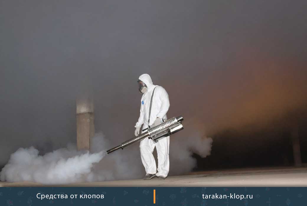 Для этого используется термомеханический генератор. При такой технологии кладки паразитов уничтожаются со 100%-ной вероятностью. Яйца насекомых гибнут при температуре 45°С. Это способ пролонгированного действия: частички отравы в мелкодисперсном состоянии висят в воздухе почти 8 часов.