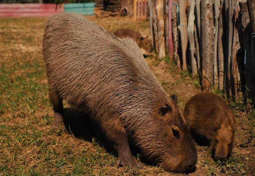 - капибара. Это самый большой грызун в мире. По внешнему виду похожи на крысу, кабана и собака. Хорошо плавают, часто живут возле водоёмов. Основной их корм — водные и околоводные растения. Их максимальная длина 1,3 метра, а вес 70 килограммов.