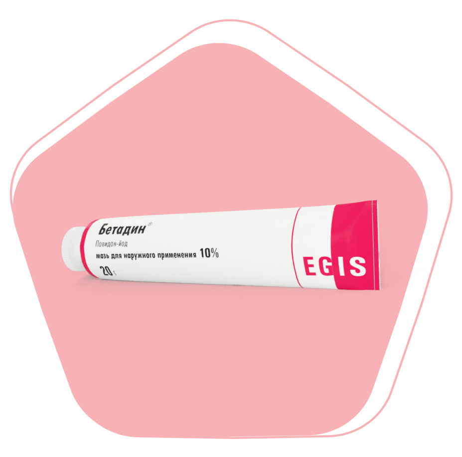 - При кожных поражениях с присоединением инфекции можно использовать мазь Бетадин, входящий в ее состав повидон-йод борется с бактериями, вирусами и грибами, а макрогол «вытягивает» из раны загрязнения. Средство наносят тонким слоем на кожу 2-3 раза в сутки.
