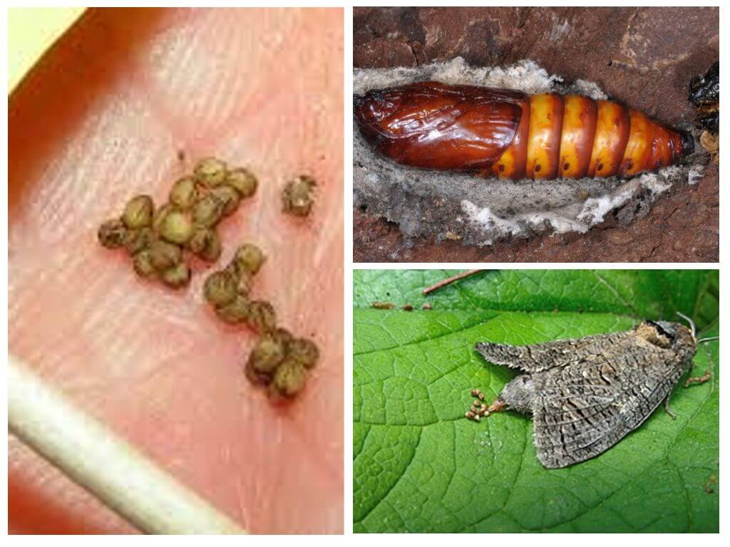 Яйца насекомого имеют удлиненную форму и размер около 1,5 мм. Уже через 10-15 дней из светло-бурых яиц с темными полосами появляются розово-красные личинки. Их длина – 8-10 см.