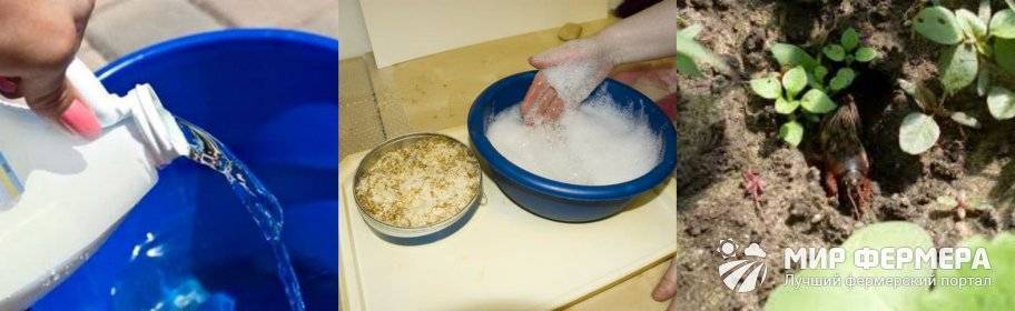 Преимущество данного метода в том, что при своей недорогой стоимости он обладает по-настоящему выраженной эффективностью. Но для получения положительного результата нужно правильно приготовить и использовать раствор. Мы приведем технологию приготовления отравы на примере стирального порошка. Возьмите 4 столовые ложки порошка и растворите его в ведре воды (10 литров). После этого нужно определить местонахождение норок вредителя и залить в каждую по 0,5 литра мыльной воды.