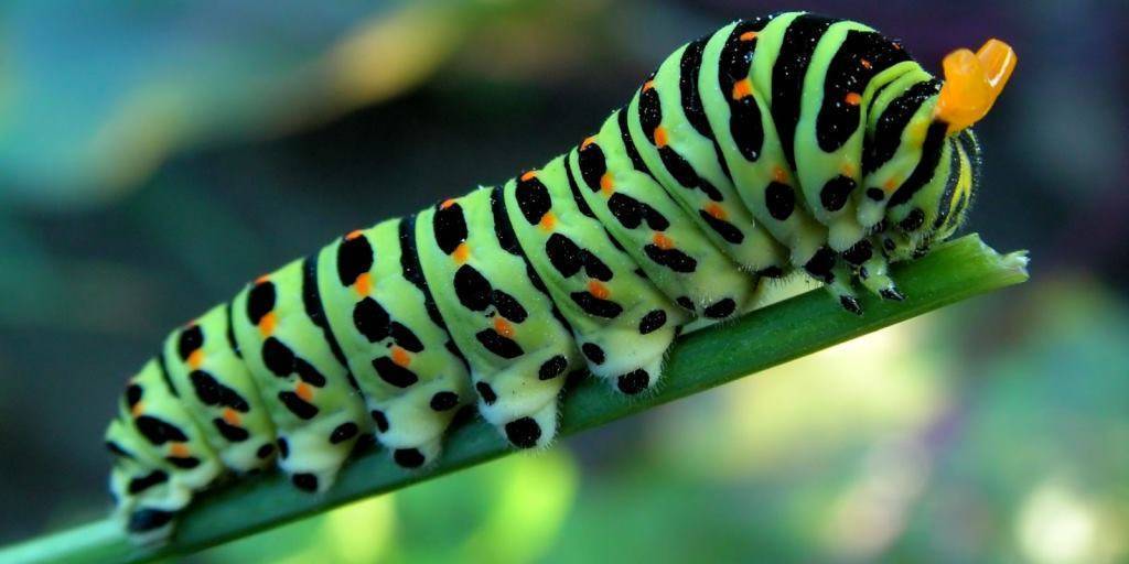 - Через 7−10 дней на свет появляются маленькие личинки. Единственная их цель — поиск пищи и питание. Червячки предпочитают молодые зелёные части растения, из которых они выпивают сок. Будущие мухи настолько прожорливы, что не останавливаются ни на секунду. Благодаря этому они очень быстро набирают вес и увеличиваются в размерах.
