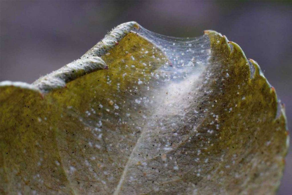 - Растение окутано паутиной. На ней можно увидеть подвижные и неподвижные комочки. Первые — это взрослые насекомые, вторые — потомство.