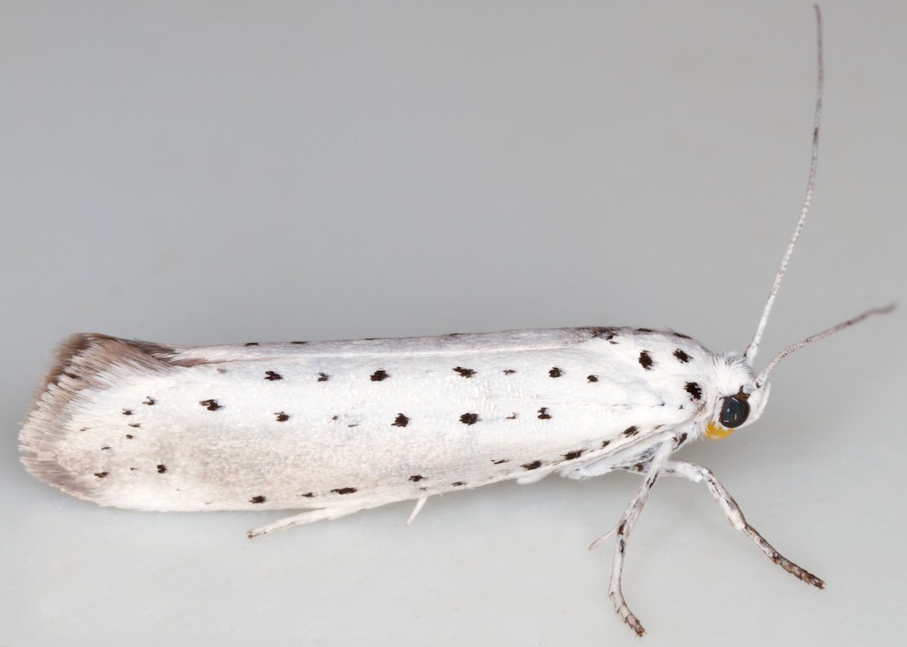 Бабочки черемуховой, яблонной, бересклетовой, ивовой и плодовой паутинных молей хорошо отличаются от остальных серебристо-белой окраской передних крыльев, покрытых черными точками. Рисунок крыла характерен для вида и может, например, состоять из 12–16 черных точек, расположенных тремя неправильными рядами (яблонная моль), или из 45–58 черных точек, расположенных пятью неправильными рядами (черемуховая горностаевая моль).
