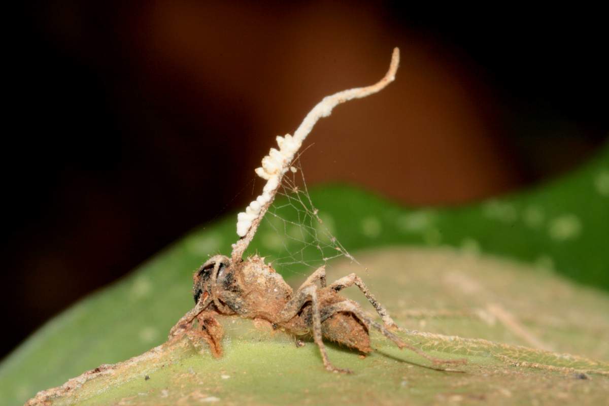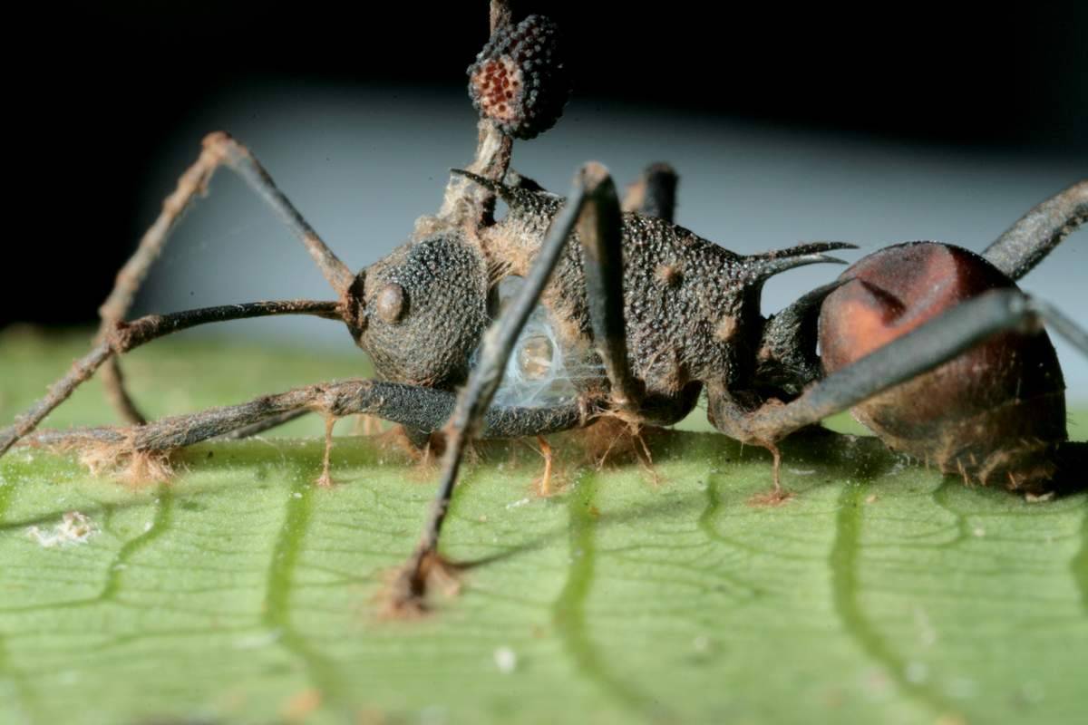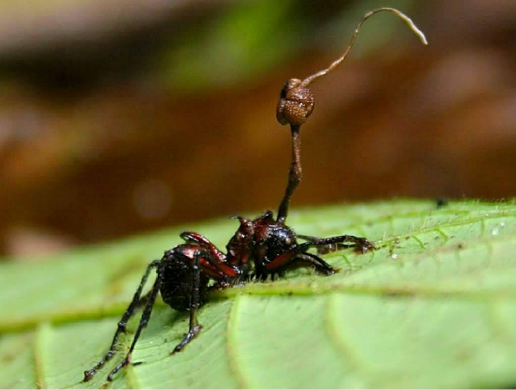 Речь идет о паразите под названием кордицепс однобокий (Сordyceps unilateralis). Обычно споры этого гриба-паразита попадают на тело муравья и прорастают внутрь его организма. Весь этот процесс сопровождается выделением в тело муравья определенных веществ алкалоидной группы, которые и заставляют муравья забыть о своих нуждах и полностью подчиниться паразиту.