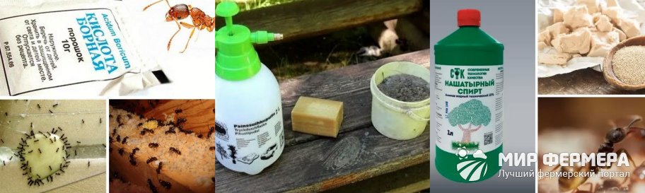 Среди огородников для борьбы с насекомыми популярно такое средство как аптечная борная кислота. Ею можно засыпать разрытое гнездо, а можно приготовить сладкую приманку, после поедания которой гибель всей семьи наступает в течение 2-3 недели. Муравьи-добытчики принесут сладкий яд в гнездо, накормят им личинки, ухаживающих за личинками муравьев и матку. Приманку готовят из 100 мл сладкой основы — варенья, повидла и 5 г борной кислоты. Приманки раскладывают в крышечках от бутылок или банок вокруг гнезда и на муравьиных тропинках.