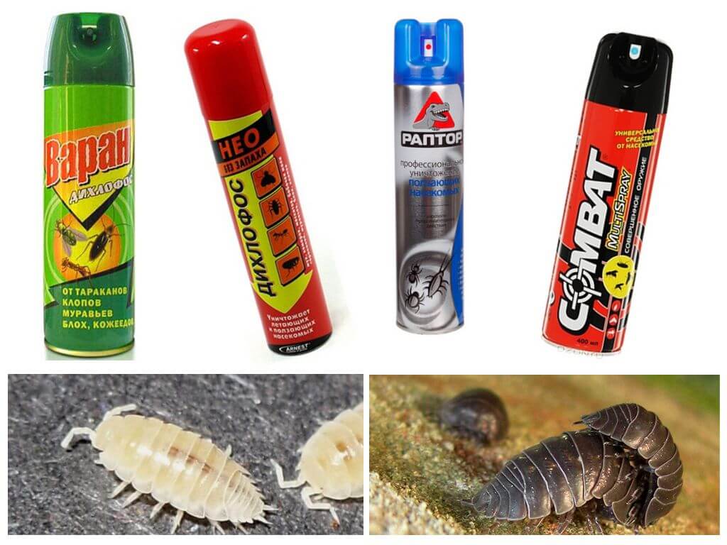 Аэрозольные препараты инсектицидного состава продаются в баллончиках. Одним из известных в народе является Дихлофос от мокриц. Согласно отзывам покупателей не менее популярными являются аэрозоли Раптор, Крот, Варан, Комбат.