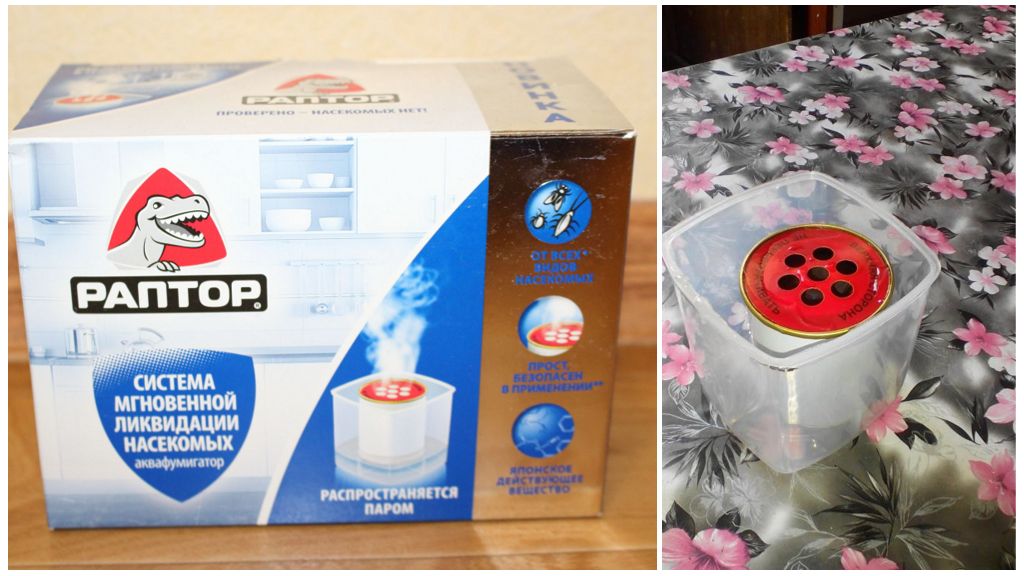 Из недостатков – нужно прятать вещи, продукты, посуду, мыть пол после окончания дезинсекции, протирать мебель, тщательно проветривать. Цена аквафумигатора Раптор около 600 руб., площадь обработки до 30 м. кв.