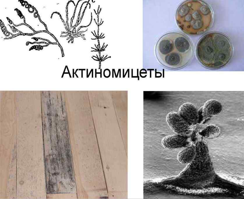 Актиномицеты (в простонародье, лучистые грибки) также любят древесину. Под их воздействием дерево меняет свой природный окрас на серый или бурый оттенок, теряет плотность, пронизывается трещинами.
