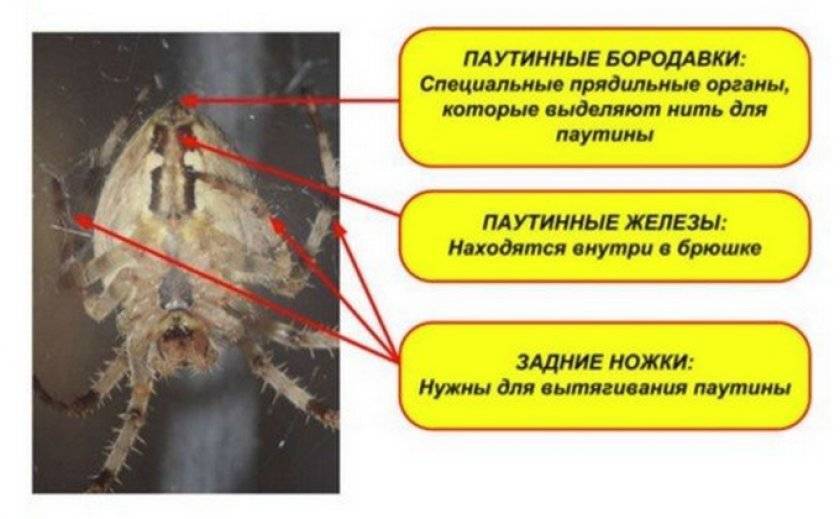 На брюшке насекомого имеются выросты – паутинные бородавки с отверстиями в виде трубочек.